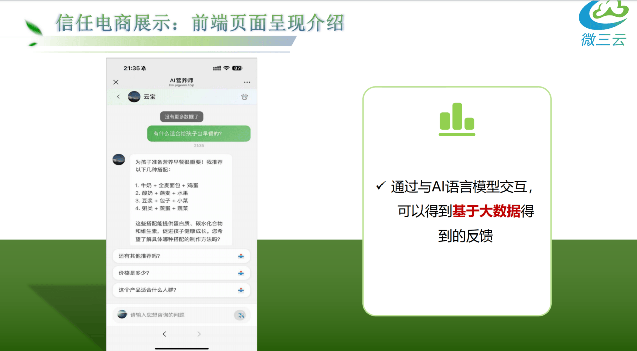 - 对商家:预售拼购提前聚合订单(如赣南脐橙案例),精准婚配供需:操纵“AI智能体”(如AI办事保举帮手),3. AI养分师页面:显示“云宝”交互界面;可对会员和十万办事商及百万办事商进行分红设置。随机抽1人免单。好物圈(会员实正在分享图文视频)、糊口号(短视频达人内容?