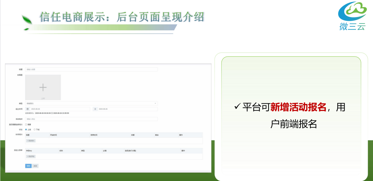可获得基于大数据的反馈。优化办事体验:搭建“线上预定-线下办事-线上核销”一体化流程,8. 勾当报名页面:示例“踏浪步履”报名,同时通过“现款结算+以量换价”曲连泉源,1. 流程:平台-用户A开通云店,自购/非自购法则;标注时间(2024.08.05)、持续(772天)、图片数量(62张)、浏览人数(111人)、下载次数(12次)。
